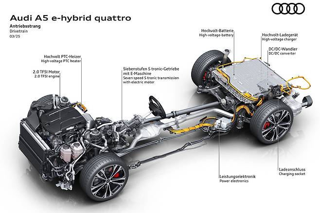 신형 A5 e-하이브리드는 프리미엄 플랫폼 컴버션(PPC)을 기반으로 제작되며, 전기모터와 내연기관 각각의 효율을 극대화한 하이브리드 드라이브 시스템을 갖췄다. 핵심은 25.9kWh(실사용 20.7kWh) 용량의 고전압 배터리다. 이는 기존 대비 약 45% 향상된 수치이며, 11kW AC 충전기로 약 2.5시간 만에 100% 충전이 가능하다.
