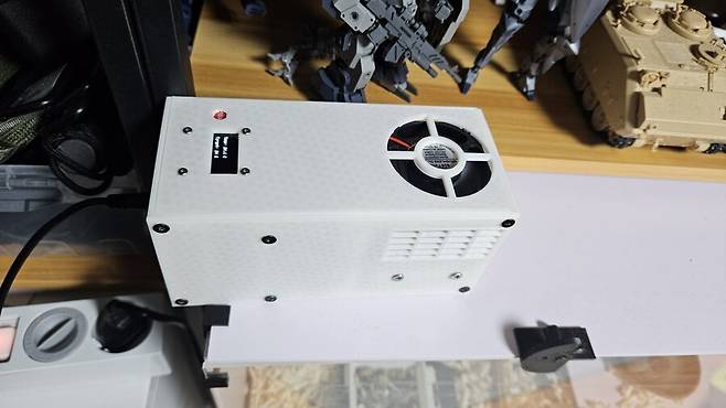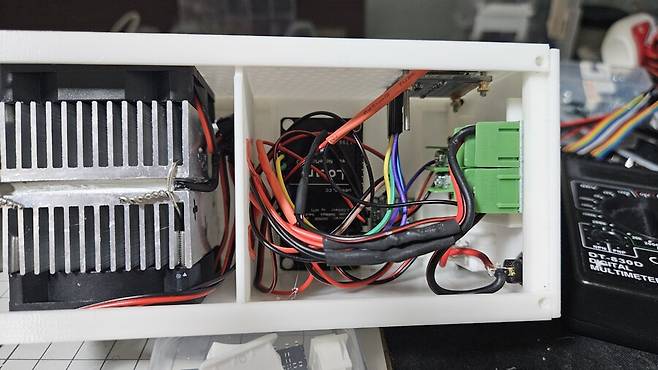 펠티어 소자를 활용해서 찬바람을 지속적으로 불어넣는 구조 입니다