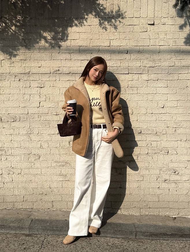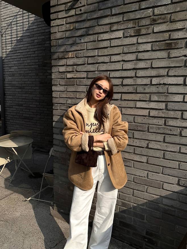 안감이 복슬복슬한 털 소재로 된 스웨이드 재킷을 메인으로 선택해서 시각적인 따뜻함을 극대화했고, 소매를 살짝 접어 안감을 노출함으로써 입체적인 디테일 포인트까지 챙겼네요.