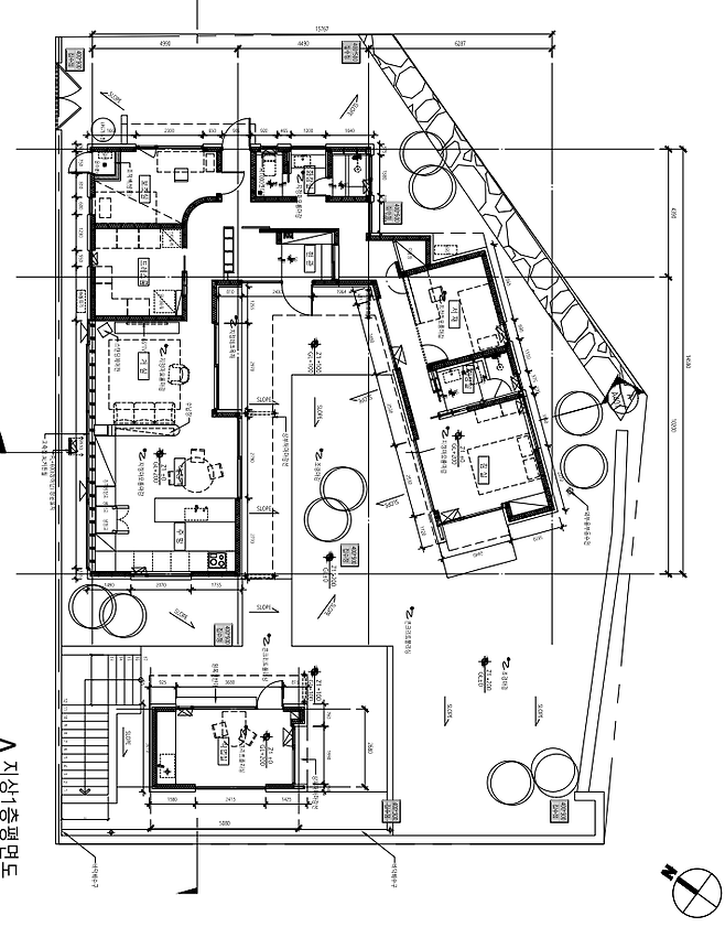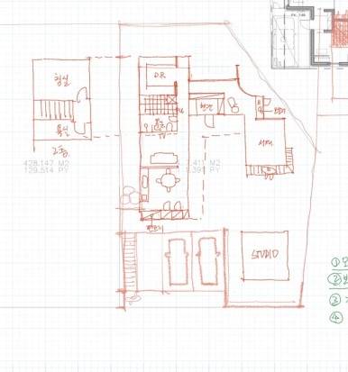 집의 도면입니다. 저희가 선택한 땅은 약간 서쪽으로 틀어진 남향이며 세로로 긴 형태를 띄고 있어서 채광과 땅의 활용을 위해 ㄷ자 형태의 집을 계획했어요.