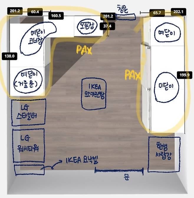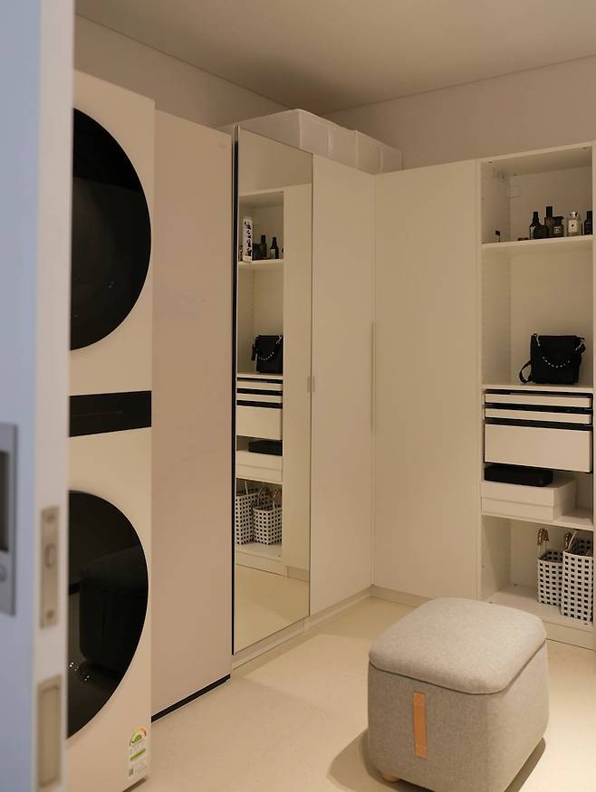 팍스나 플랏사 등의 수납 시스템은 이케아 홈페이지에서 위와 같이 직접 미리 구성해볼 수 있어서 공간을 꾸밀 때 편리합니다. 워시 타워와 스타일러 또한 드레스룸 내부에 설치해놓았어요.