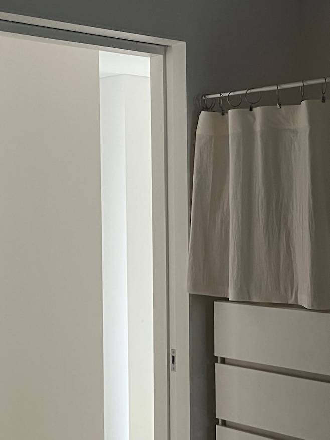 드레스룸 문은 옷장 문이나 서랍을 여는 데에 방해가 되지 않도록 여닫이가 아닌 미닫이 문(포켓 도어)로 만들었어요.