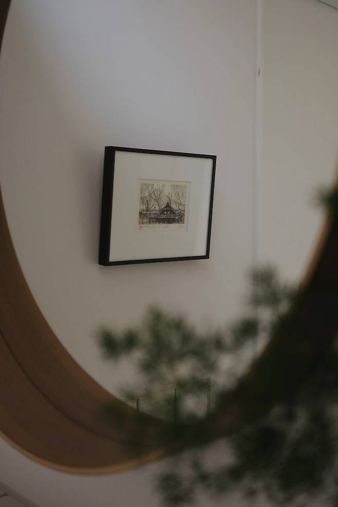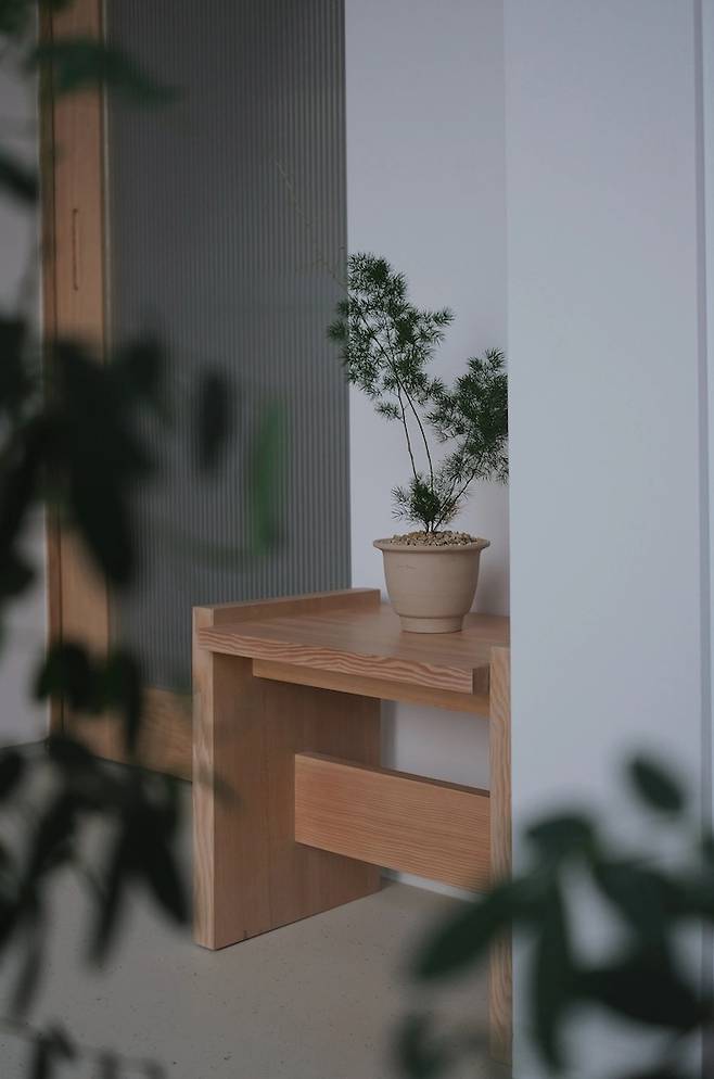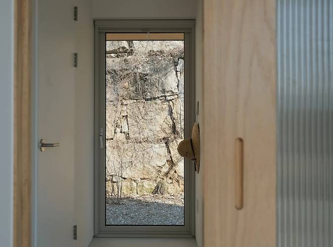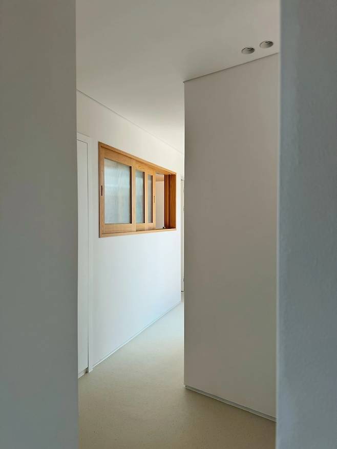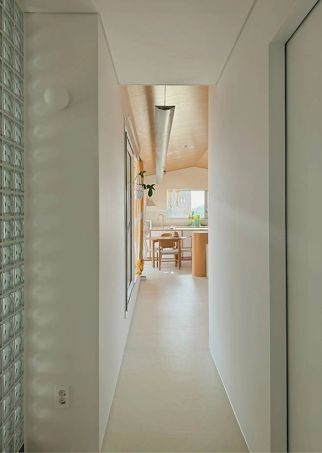 픽스창 옆으로 이어지는 세 번 꺾이는 복도는 마치 골목길처럼 다음에 어떤 모습과 만날지 기대하게 해요.