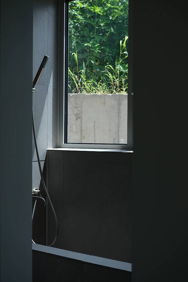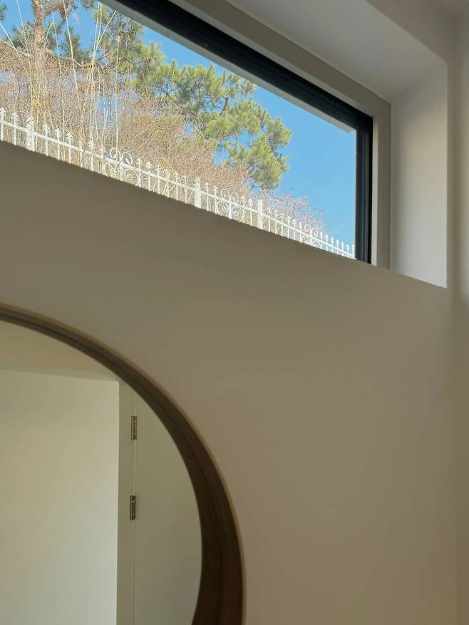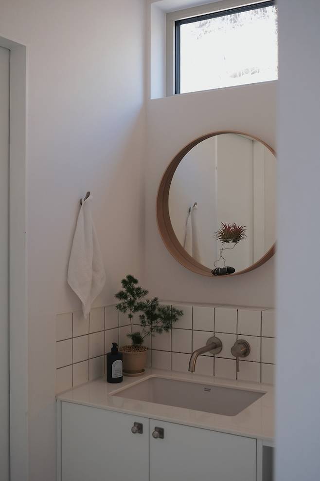 세면공간의 거울 위쪽 고측 창은 사계절을 담아냅니다.