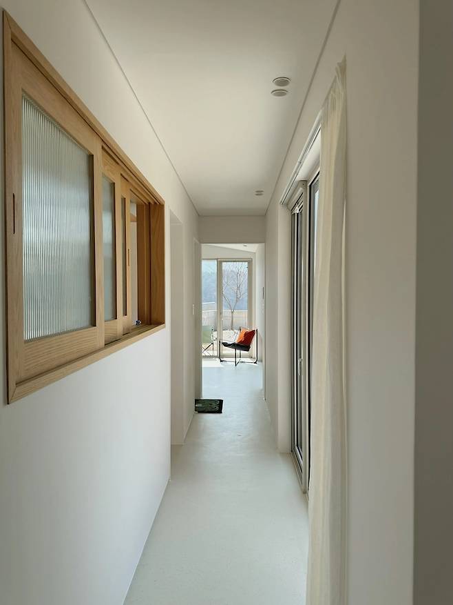저희의 주택은 ㄷ자 구조를 띄고 있는데, 그러다보니 각 실로 이동을 위해 복도가 매우 길어졌어요. ㄷ자 안쪽으로 이어져 여러 각도로 꺾인 복도는 거실에서 욕실로, 침실로 이동하게 함과 동시에 집 내부를 거닐게 하고, 마주 보는 외부로 뚫린 창을 통해 서로를 바라보게 하며, 실내에서도 마당을 걷고 있는 듯한 느낌이 들게 합니다.
