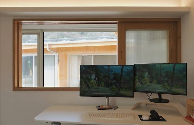 복도와 방 사이에는 모루유리 목재 창이 있고, 복도에 전면 창이 나 있어 컴퓨터를 하려고 책상에 앉으면 모니터 너머 거실, 툇마루 위의 처마와 멀리 있는 산등성이가 지붕처럼 펼쳐집니다.