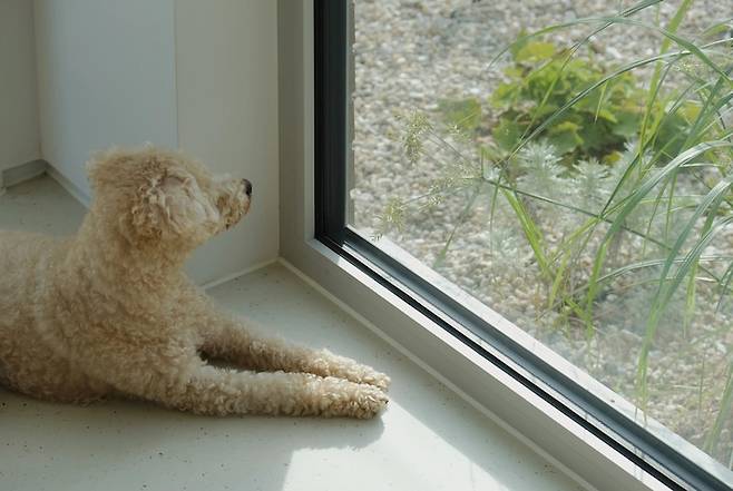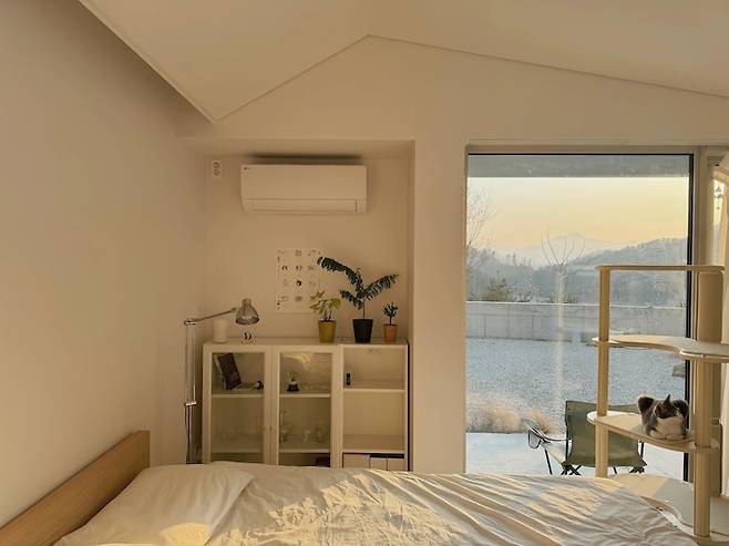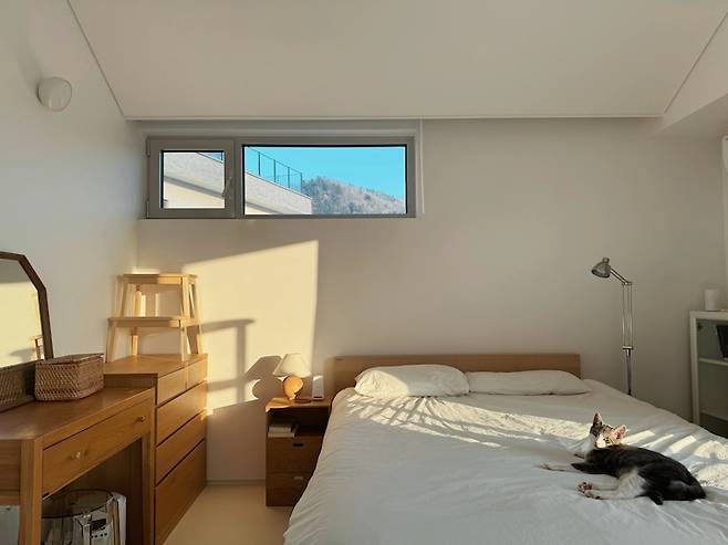 침대에 있으면 발치 창을 통해 마당의 조경과 만납니다. 강아지와 고양이에게는 이 창이 맞춤형 화면인지 창 앞에서, 혹은 침대에 누워서 한참 바깥을 구경하곤 해요.