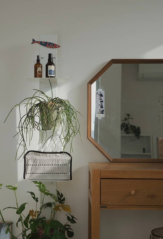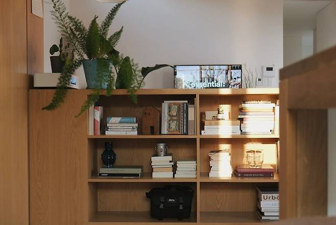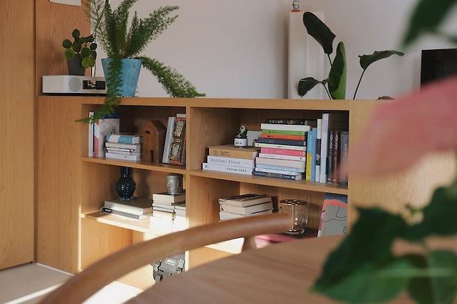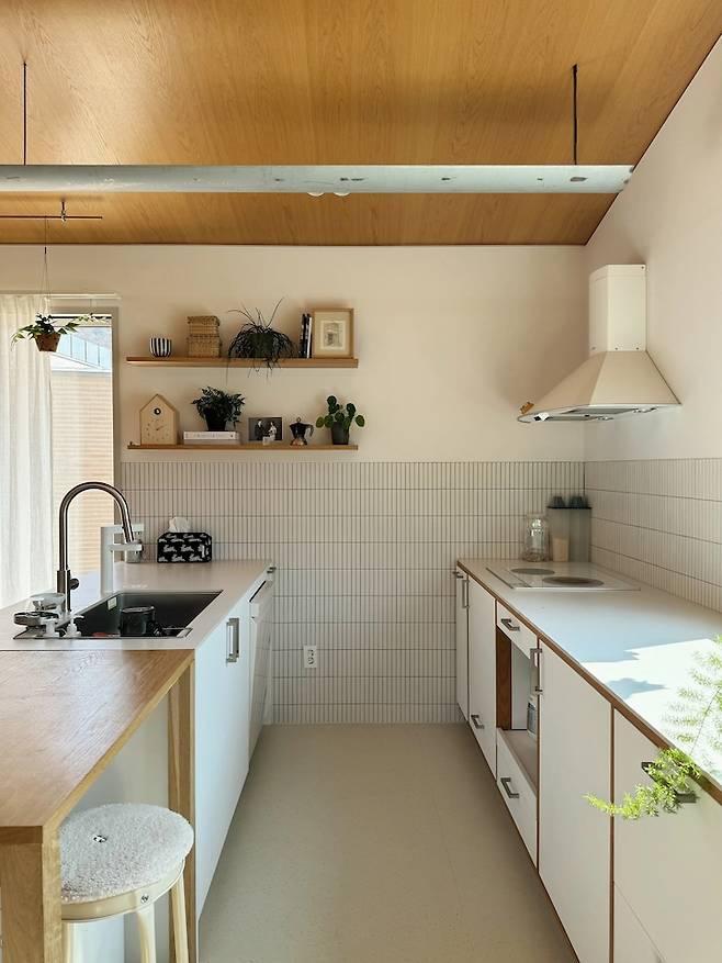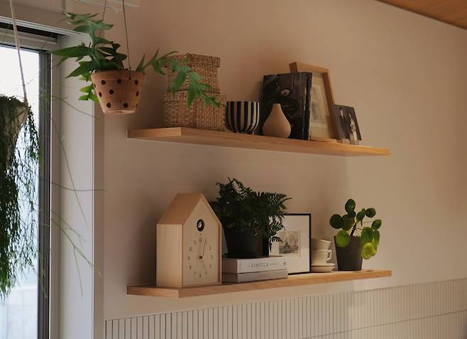 주방 한쪽 벽면에는 원목 선반을 설치해 식물과 액자 등을 두었어요.