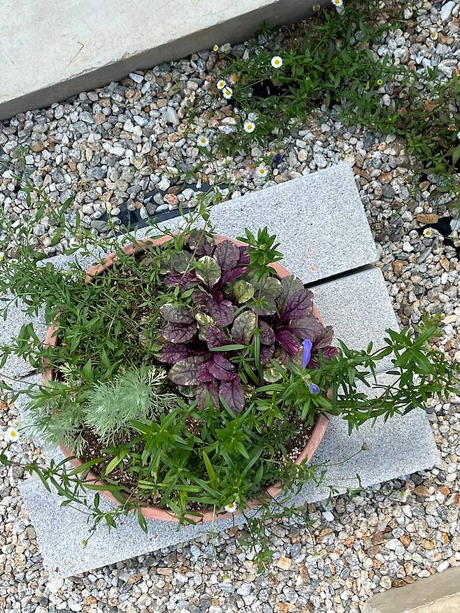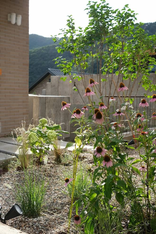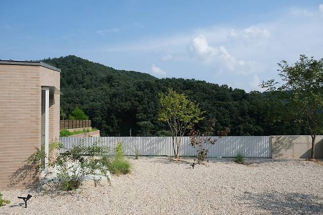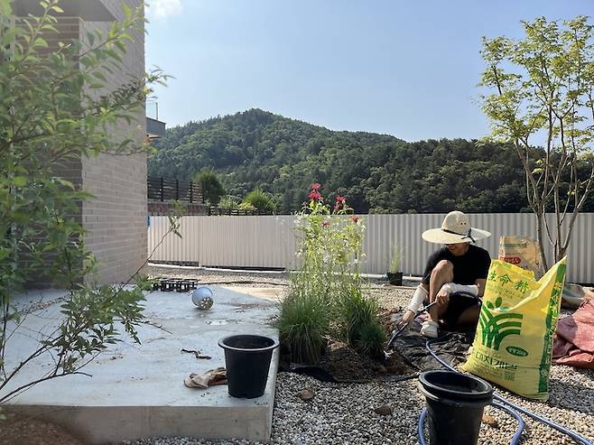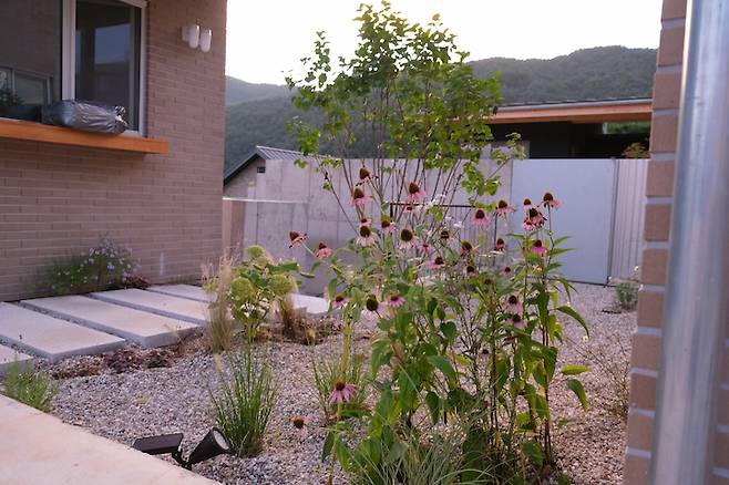 대개 주택 마당은 잔디마감을 하는 경우가 많은데, 관리가 어려울 것 같아 저희는 잡초방지 시트를 깐 다음 그 위를 자갈로 덮었습니다. 그 후 조경가님의 도움을 받아 전반적인 식물과 나무의 종류, 위치를 정하고, 저희가 직접 식물들을 심었어요. 해가 따갑게 내리쬐는 날이라 땀이 줄줄 흘렀지만 전부 심고나서는 말할 수 없이 뿌듯했었어요.
