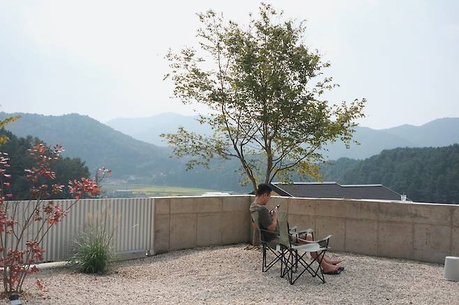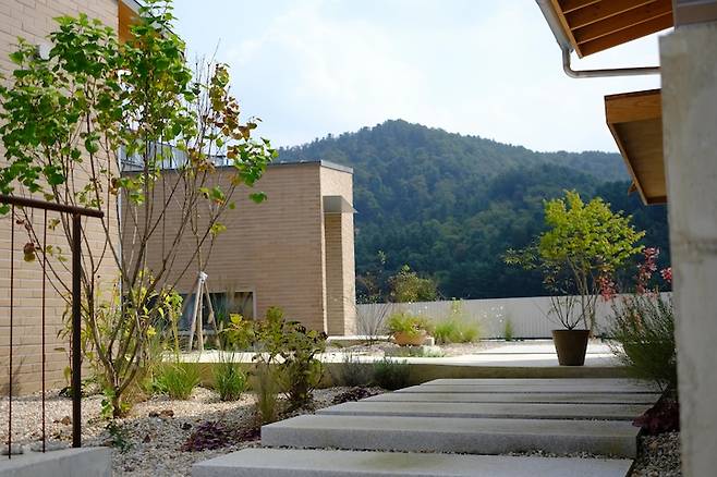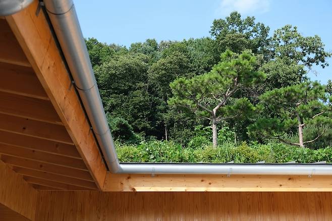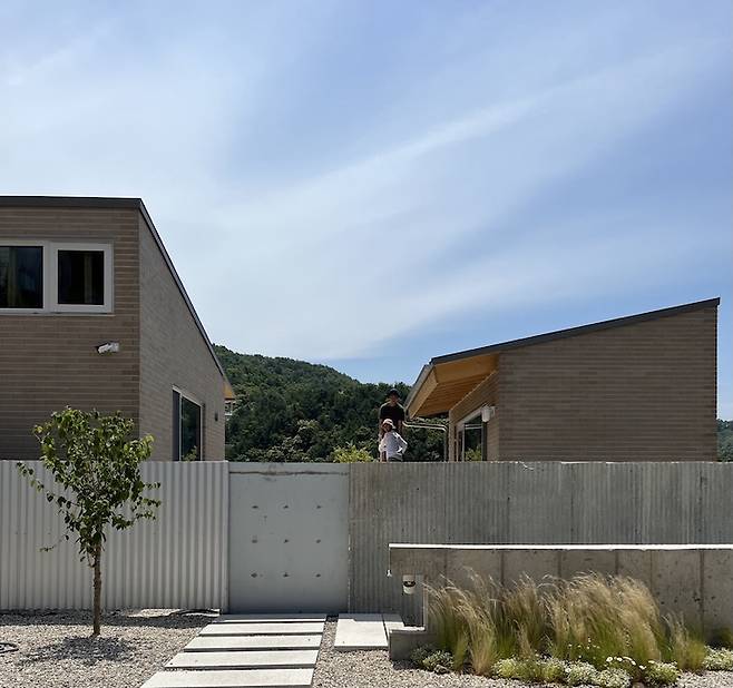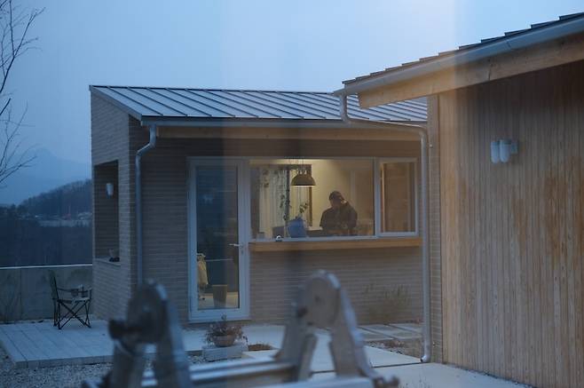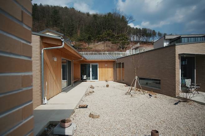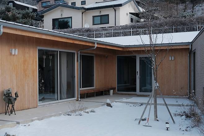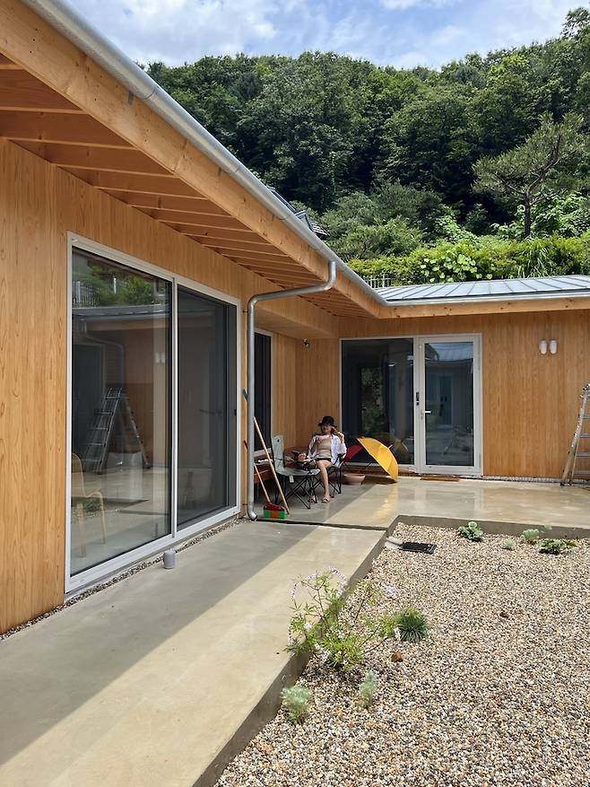 ㄷ자 단층 집으로 완성된 집의 한쪽에서 반대편을 올려다보면 집의 지붕 위로 산 머리가 빼꼼 보여서 마치 산등성이 지붕을 가진 것처럼 보이는데, 2층으로 설계했다면 이러한 그림을 볼 수 없었겠지 생각에 어쩔 뻔 했나 싶습니다.