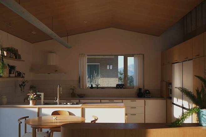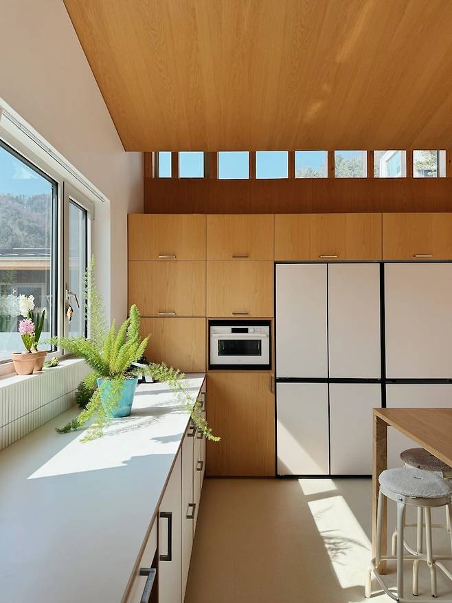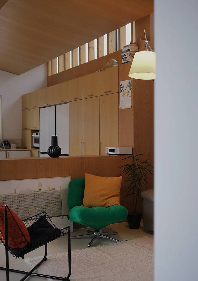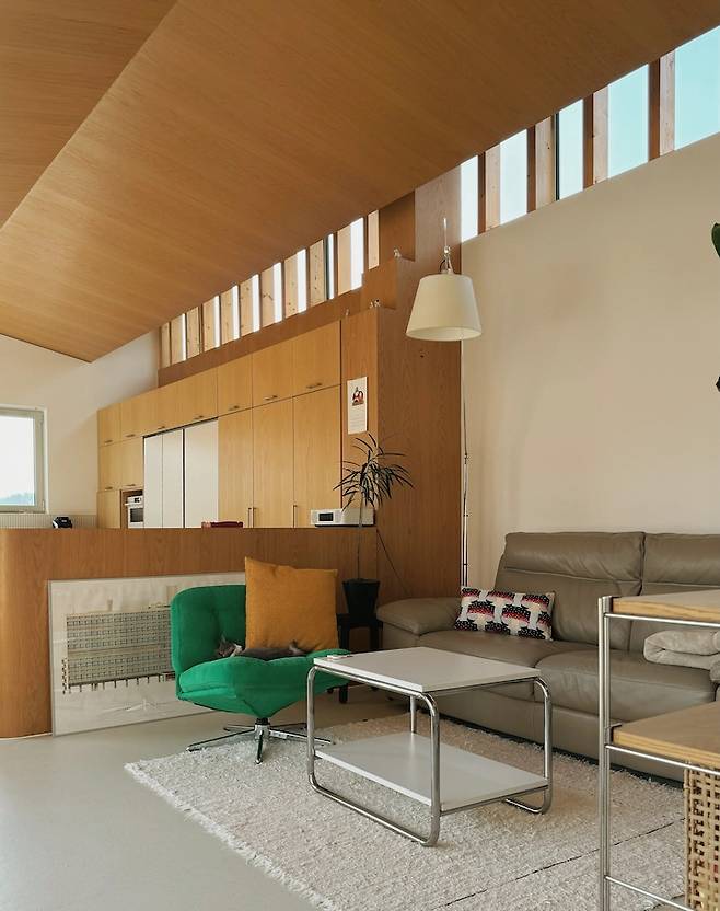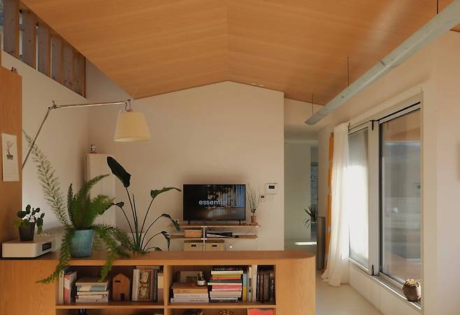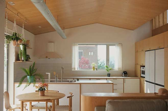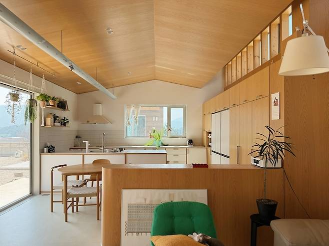 주방에서 바라본 거실의 모습입니다. 박공 모양의 무늬목 천장이 주는 따뜻한 느낌이 집을 아늑하게 만들어줘요.