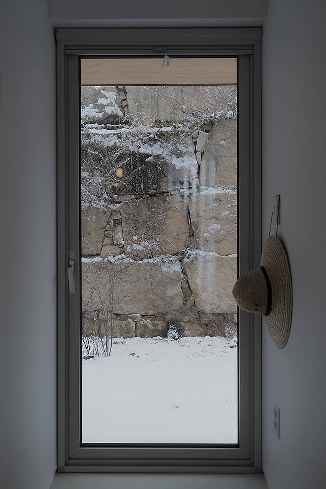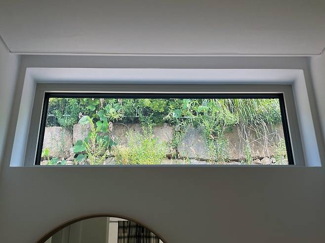 중문을 열면 창을 통해 집의 뒤편 석축이 보입니다. 뒤편 석축에 여름에는 푸릇푸릇한 풀들이 뒤덮고, 겨울에는 하얀 눈이 쌓이곤 해요.