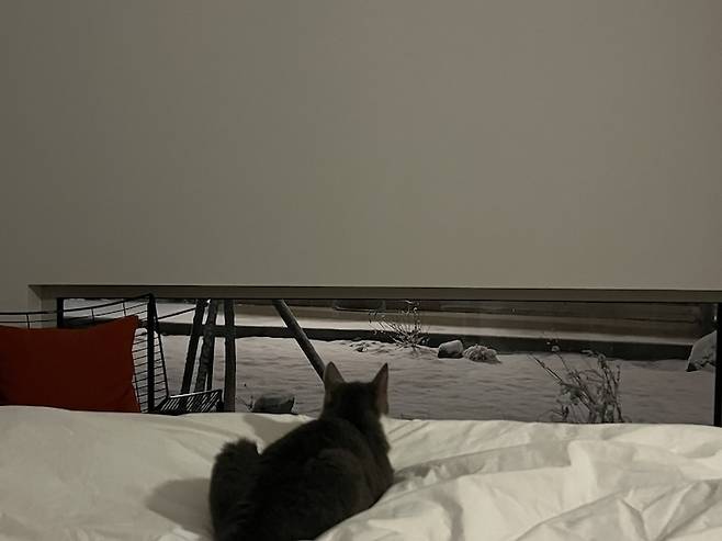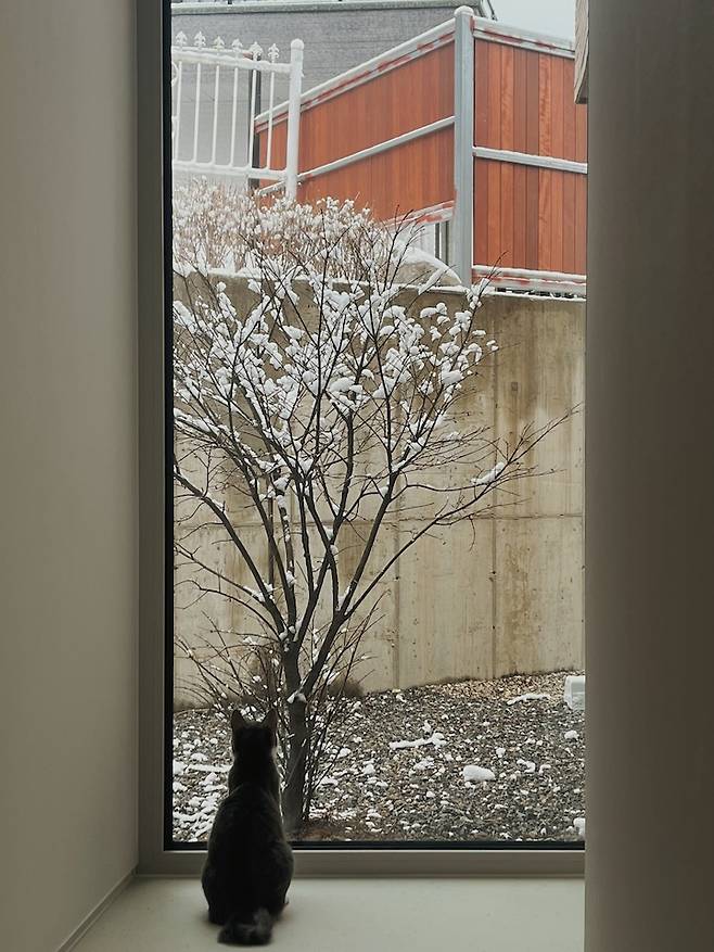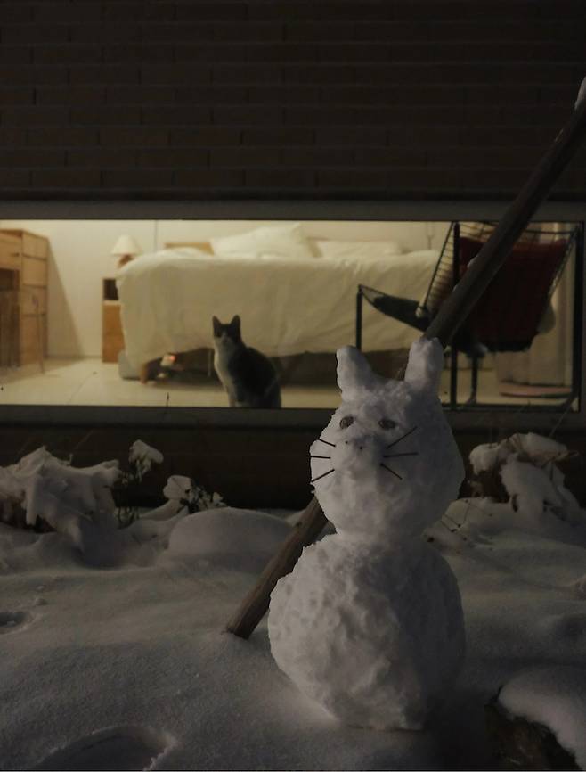 2월인데도 폭설이 내린 날, 마당에 고양이 헌정 눈사람(눈고양이?)을 만들었어요. 고양이가 발치창을 통해 눈고양이를 흐뭇하게 바라보고 있는 것 같네요.