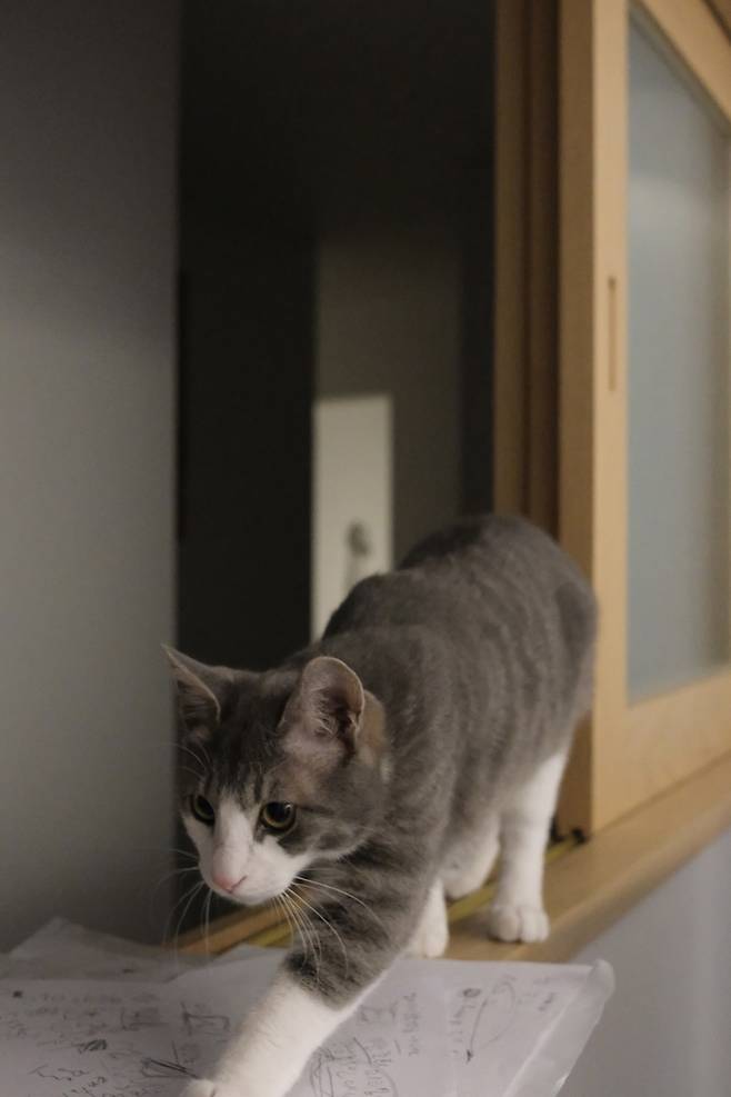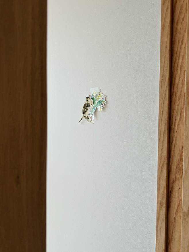 중문 앞에 작년 일본 여행에서 구매했던 꽃을 든 고양이 엽서를 붙여놓았는데, 나중에 저희 고양이를 입양하고 나니 엽서의 고양이와 똑 닮아서 놀랐던 기억이 납니다.