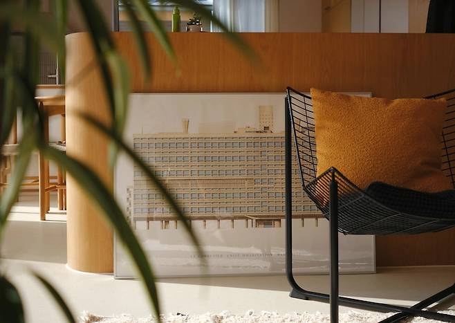 선물 받은 르코르뷔지에의 유니테 포스터로 심심해보이는 붙박이 책장 뒷벽을 가려주었어요.