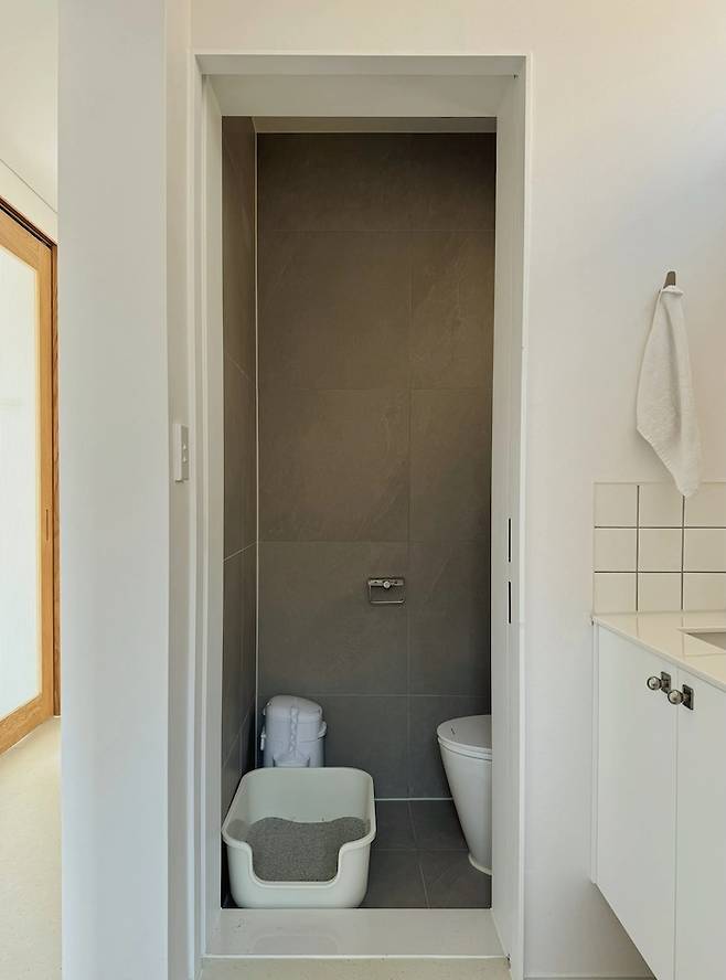 왼쪽의 미닫이 문을 열면 변기실이 나옵니다. 지금은 고양이 화장실로 주로 사용되고 있어요.