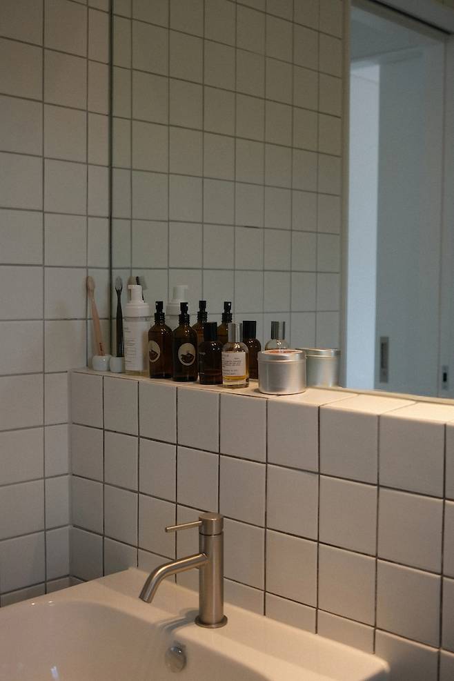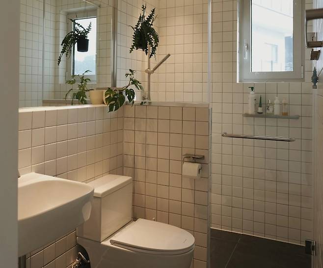공용 공간 화장실은 세면 공간, 변기실, 욕조실로 나누어져 있습니다. 이렇게 나눔으로 인해 공간과 공사 비용이 더 들기는 했지만, 청소가 간편하고 사용할 때에도 '각자의 공간에서 일어나는 활동'에 더 집중하게 되는 느낌이 들어요.