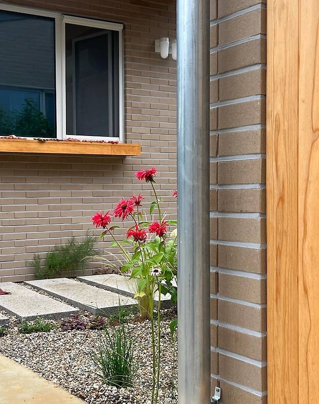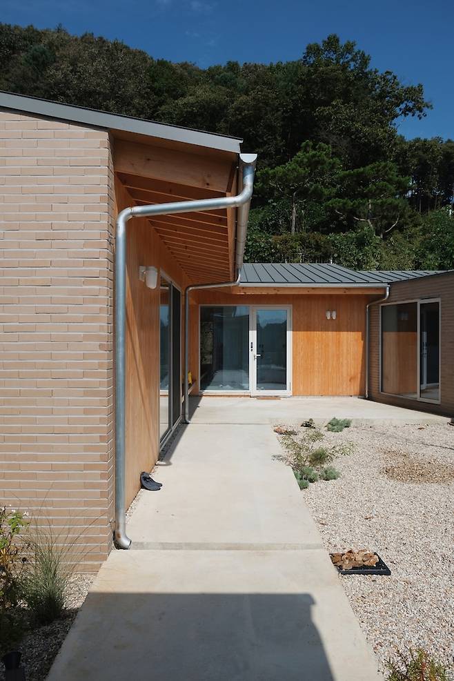 저 멀리 현관 문이 보입니다. 집으로 들어가는 쪽으로 처마를 만들어 비를 피할 수 있어요. 설계 과정 중에 남편은 처마에 집착하다시피 했는데, 주택에 살아보지 않은 저는 처마를 대수롭지 않게 여겼어요.