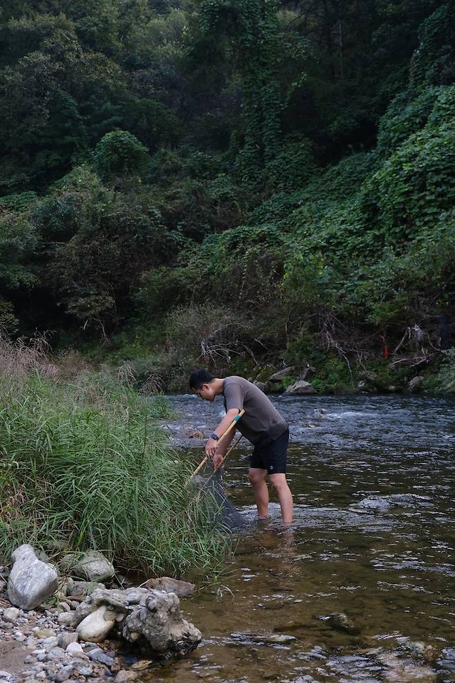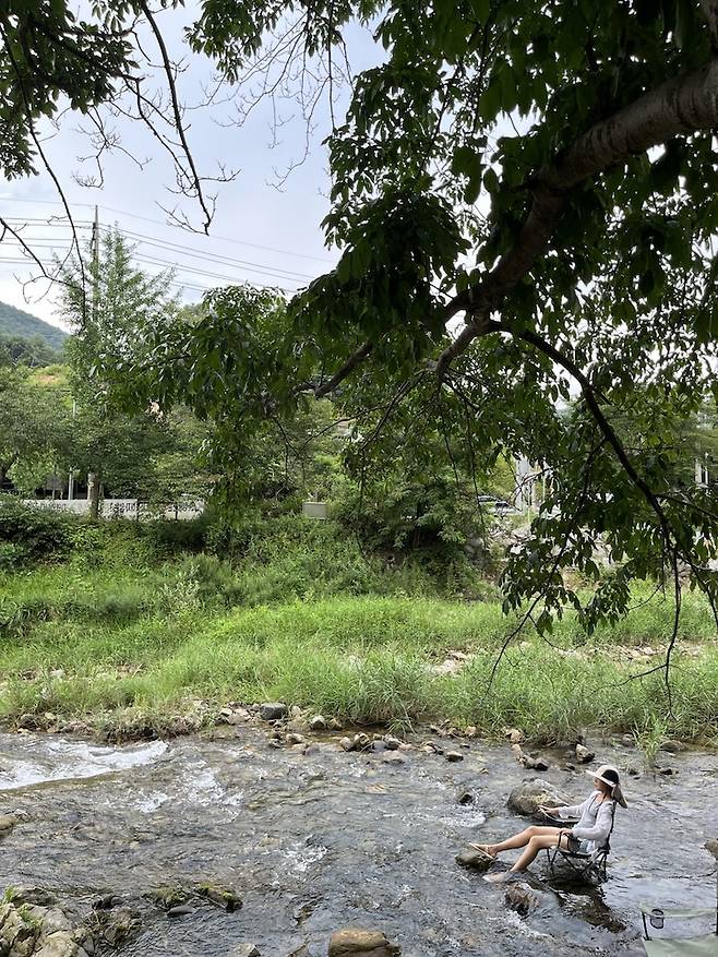 집앞 개울로 나가 의자를 펼쳐놓고 시원한 물에 발을 담그고 신선놀음을 즐기기도 해요. 남편은 뜰채를 구해와서 물고기잡이 삼매경입니다.