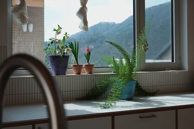주방 앞쪽으로는 상부장 대신 마당 입구 쪽으로 큰 창을 내었어요. 창밖으로 라일락 나무가 계절에 따라 푸르고 붉은 모습을 보여줍니다.
