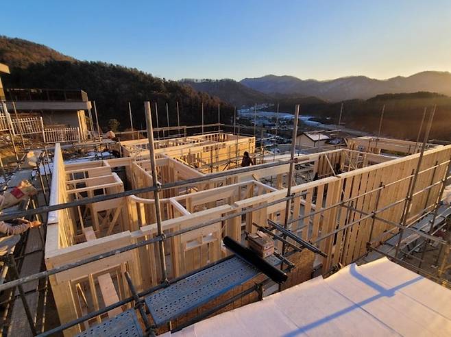 옆집 마당에서 찍어준 사다리에 오른 저희 모습입니다. 옆집에는 남편의 동업자이자 오랜 친구 부부가 집을 지어 살고있어요. 시골의 단독주택에서는 좋은 이웃을 만나는 것도 정말 중요한데, 같이 땅을 사고 집을 지으면서 비용도 꽤 절약되었고 서로에게 도움이 되는 이웃으로 지내고 있습니다.
