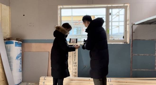 두 개의 마룻대는 현관 천장에 올려졌고, 지금은 마감으로 덮여있지만 천장 속에 단단히 자리 잡아 집에 드나들 때마다 저희를 내려다보며 집을 지키고 있습니다.