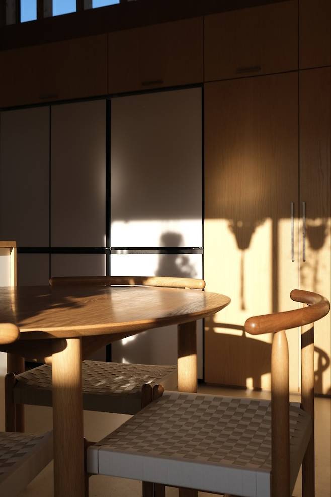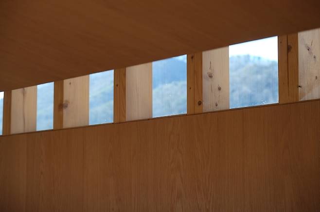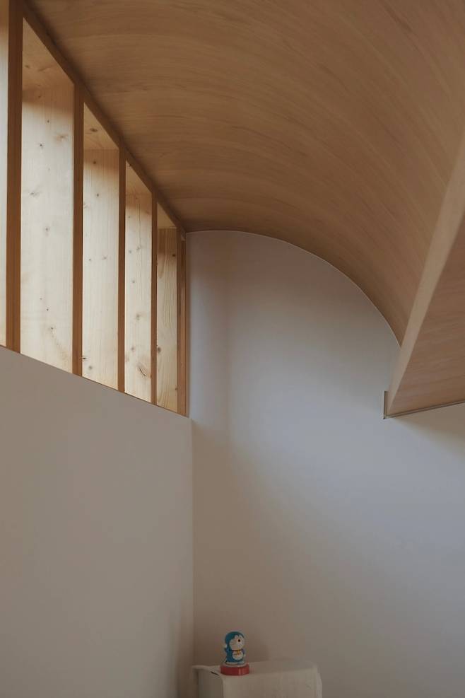 고측 창으로는 경량 목구조의 구조목을 그대로 노출시켰어요. 목조 주택만이 가질 수 있는 온화함입니다.