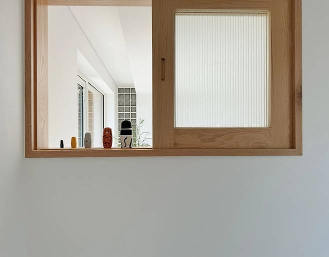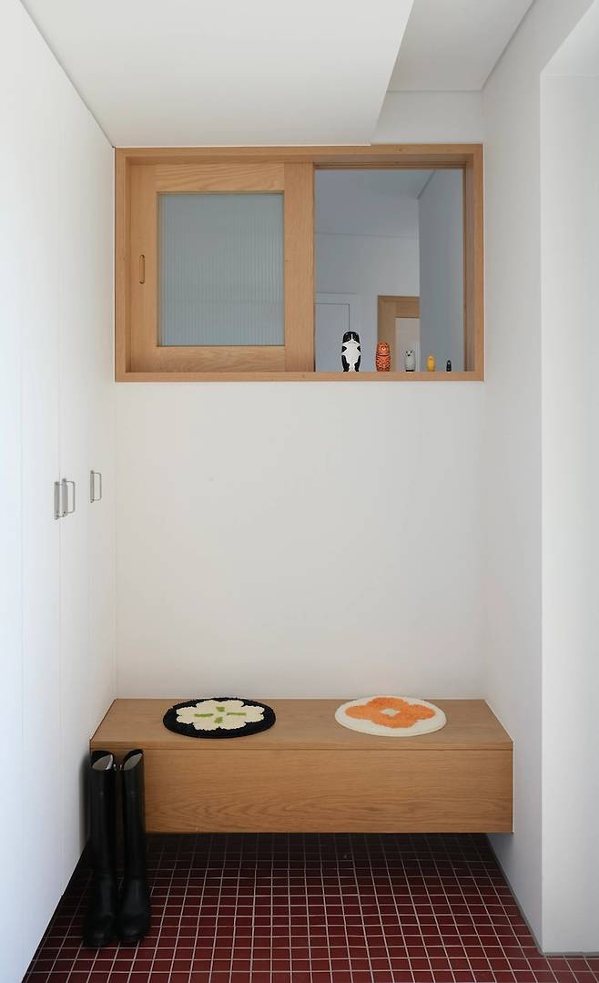 현관 한 켠에는 앉아서 신발을 신을 수 있도록 벤치가 있으며 그 위로 집 내부로 뚫린 목재 창이 있습니다.