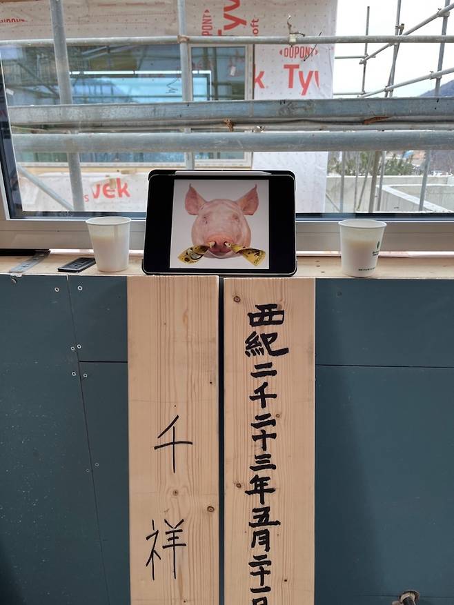 둘이서 단출하게 상량식도 치뤘습니다. 마룻대에 양가에서 직접 덕담을 써주셨고, 아이패드로 띄운 돼지 머리와 함께 현대판으로 지냈어요.
