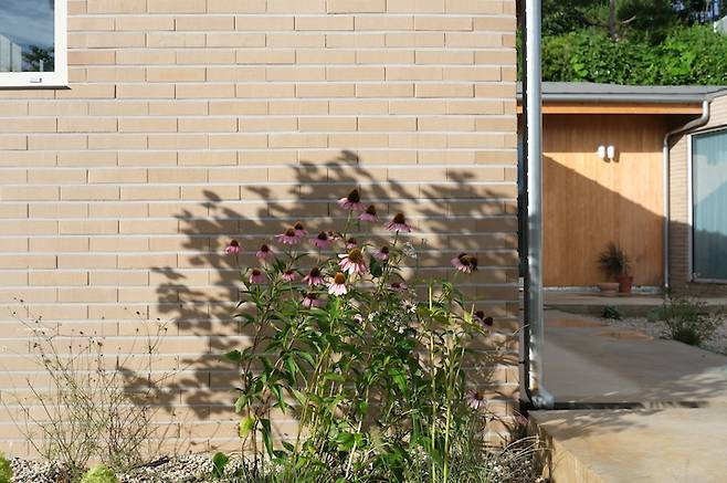 마당으로 들어서면 보이는 모습입니다. 우측으로는 작은 다용도실(작업실), 좌측으로는 집이 보여요. 건물의 외부는 벽돌 타일과 목재로 마감했습니다.