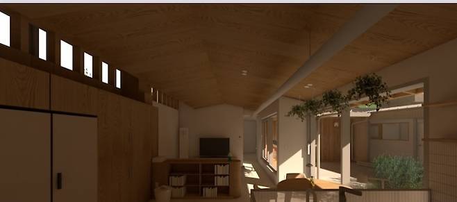 공사 시작 전 설계 단계의 모델링 이미지에요. 박공 모양 천장이 의도한 대로 시공된 것 같아 볼 때마다 만족스럽습니다.