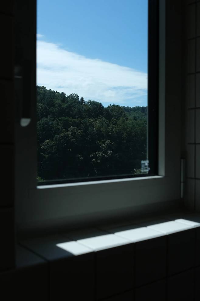 여름에 찍어놓았던 샤워 부스 창밖 모습입니다. 아파트나 빌라 등 공동 주택에는 욕실에 창이 나있지 않는 경우가 많은데 샤워실에 창을 만들어 샤워하면서 새소리도 듣고 바깥의 풍경을 볼 수 있어서 짧은 시간이지만 행복해져요.