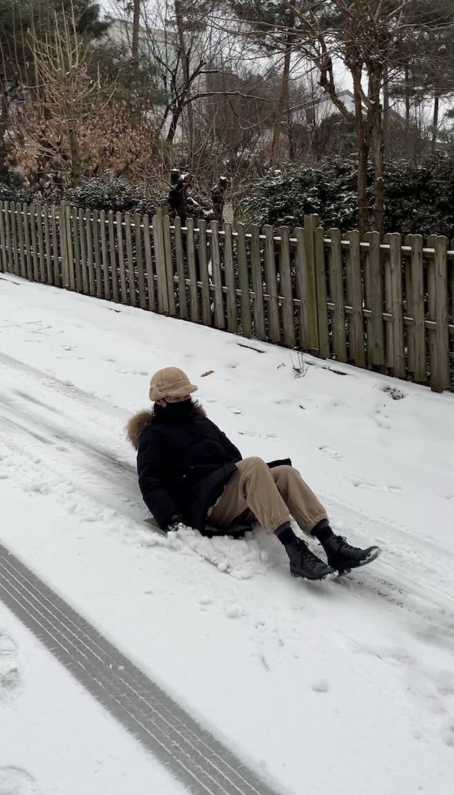 눈을 치우다가 지칠 땐 작업실 바닥에 깔고 남았던 장판을 가지고 신나게 눈썰매도 탑니다. 저희 집이 꽤 고지대에 위치하고 있어서 오르막길이 가파른 편인데 눈이 오는 날은 너무나 완벽한 썰매장으로 변신해요.