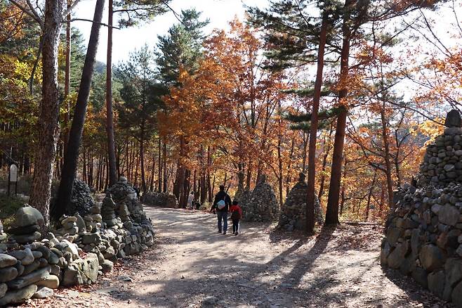 자연석으로 원뿔 형태를 띠는 탑들이 줄지어 서 있는 모습을 바라보면 마치 산 전체가 하나의 성지처럼 느껴지기도 합니다. 특히 초겨울의 모정탑길은 나뭇잎이 대부분 떨어져 돌탑의 형태가 더 선명하게 드러나며, 탑 사이로 스며드는 햇빛이 은빛으로 반짝여다른 계절과는 또 다른 고요한 풍경을 보여줍니다.