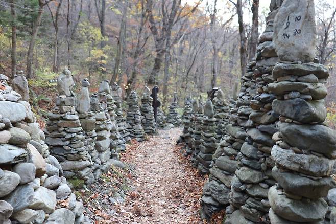 모정탑길이 특별한 이유는 이곳이 단순한 트레킹 코스가 아니라 ‘한 사람의 삶’이 담긴 길이기 때문입니다. 돌탑을 쌓은 이는 고(故) 차순옥 할머니. 아들 둘을 잃고, 남편까지 병으로 고통받던 시절꿈에서 산신령이 “돌탑 3천 개를 쌓으면 평안이 찾아올 것”이라고 전했다 합니다.