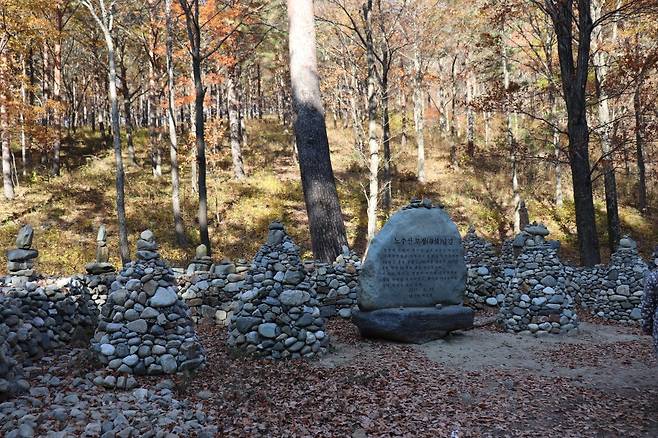 그 말씀 하나만을 붙잡고, 1986년 노추산 계곡에 터를 잡은 뒤세상을 떠난 2011년까지 무려 26년 동안이 계곡을 돌과 마음으로 채워나갔습니다. 지금 모정탑길을 걸어보면 돌 하나하나에 담긴 정성과 기원의 마음이 그대로 전해져 걷는 이들 모두가 자연스레 걸음을 늦추게 됩니다.