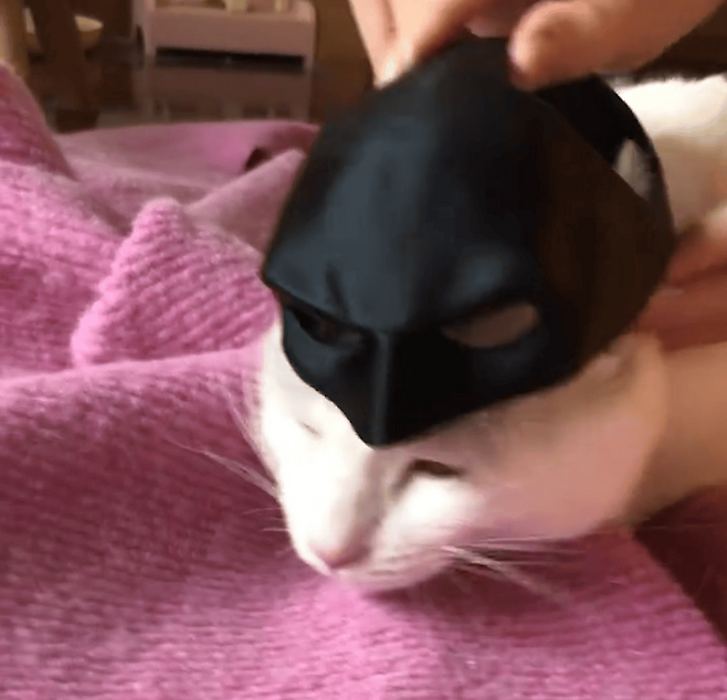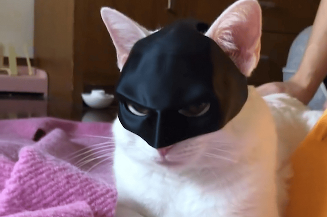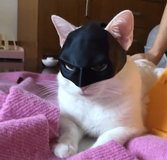 가면을 쓴 순간, 평범했던 고양이는 완전히 변신했습니다! 원래 귀여웠던 젤리 같은 앞발로 앉아있던 고양이는 이제 삼각형 귀가 달린 가면을 쓰고 주인을 강렬하게 응시했습니다. 마치 디즈니 영화에서 튀어나온 '다크 나이트' 같은 모습이었죠.