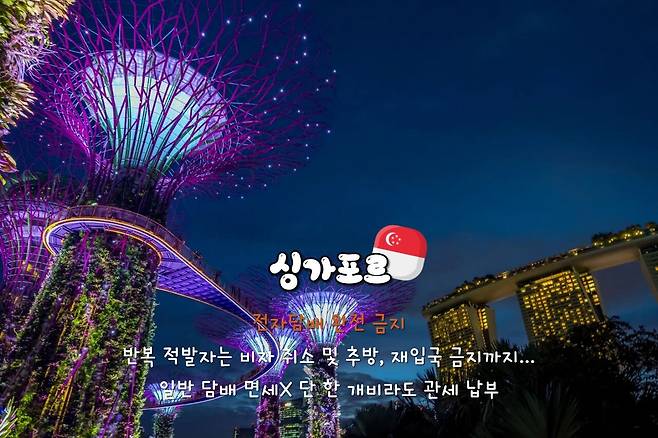 ✔싱가포르는 일반 담배 역시 면세 한도가 없으며 단 한 개비라도 모두 관세·세금을 납부해야 합니다. 반드시 세관에서 “Red Channel(신고 통로)”을 이용해야 하며, 미신고 적발시 벌금 최대 5,000 싱가포르 달러가 부과됩니다.
