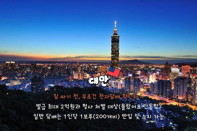 2023년 1월 개정된 ‘담배 해로운 물질 방지법’에 따라 대만은 전자담배와 액상기기의 생산, 판매, 유통, 사용을 포함해 완전히 금지하는 국가입니다. 입국 시 세관에서 적발되면 벌금(최대 100,000~500,000 대만 달러, 약 417만~2억 1,350만 원)과 형사 처벌 대상이 될 수 있습니다.