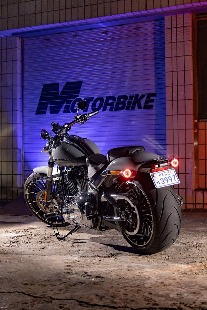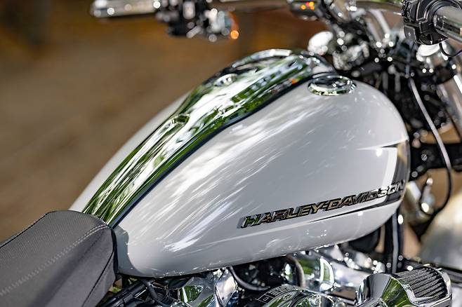 3년의 공백기를 가진 후 2023년, 브레이크아웃이 다시 돌아왔다. 할리데이비슨의 120주년과 브레이크아웃 출시 10주년을 맞이해 대대적인 업데이트를 거친 뉴 모델이다. 전체적인 디자인은 더 다부지고, 화려하다. 먼저 눈에 띄는 것은 엔진과 배기라인 전체에 크롬파츠를 두른 것이다. 한눈에도 존재감이 훨씬 커졌다. 여기에 초기 CVO 브레이크아웃의 터빈 휠이 재현된 것도 중요한 포인트다. 여기에 브레이크아웃 전체를 관통하는 키워드라고 하면 미니멀리즘이라고 할 수 있겠다. 강조하고 싶은 부분은 강조하고 나머지 요소들은 최소한으로 줄여 명암을 극대화한 것이다. 그래서 한눈에도 긴 실루엣과 과장된 전후 휠이 먼저 눈에 들어온다.