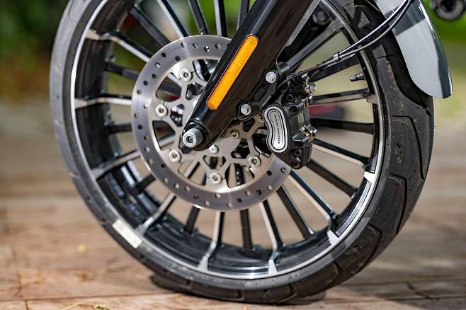 21인치 터빈 휠은 그 자체가 멋진 조형물이다. 액시얼 타입의 4피스톤 브레이크 캘리퍼는 싱글디스크임에도 충분한 제동력을 만든다
