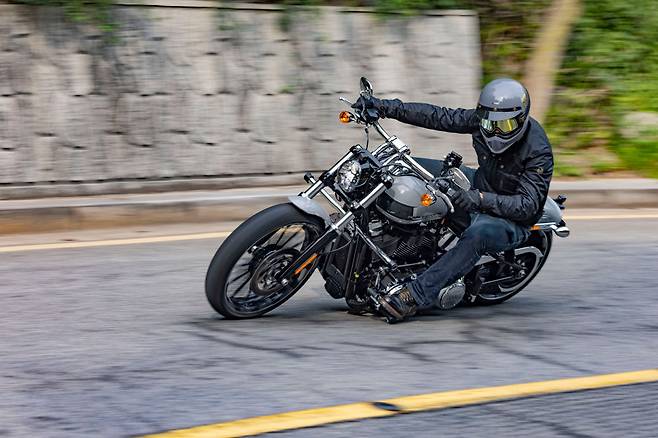 리어 240mm의 거대한 타이어에다가 직선 가속에 모든 걸 집중한 것 같은 디자인이라 코너링 성능은 처음부터 기대하지 않았다. 그리고 이전에 경험했던 브레이크아웃의 어색했던 핸들링도 기억에 남아있었기 때문이다. 하지만 예상을 뒤엎고 핸들링의 변화는 극적인 수준이다. 포크 각도를 바꾸고 섀시의 세팅을 개선한 덕분이다. 덕분에 구불구불한 산길에서 정말 재밌게 탔다. 차체가 기울어지는 속도가 일정하고 기울임과 비례해 자연스럽게 방향을 바꿔나가기 때문에 라이더가 원하는 대로 움직여주는 느낌이다. 특히 셀프스티어가 강하게 말려들어오는 일이 없이 자연스러운 핸들링을 보여주는 것이 놀랍다. 빠르게 방향 전환을 할 때 엉덩이 쪽에 느껴지는 큼직한 덩어리감이 가끔씩 그 존재를 어필할 뿐이다. 낮고 긴 스타일을 고수하다보니 기울임 한계가 낮은 것도 하나의 특징이지만 그 한계 안에서는 안심하고 달릴 수 있었다.