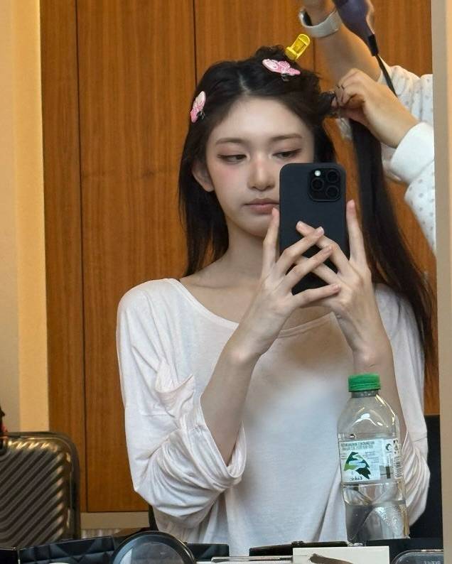 마지막 컷에서는 스타일링 중인 이서의 모습이 포착됐다. 아이보리색의 부드러운 티셔츠를 입고 있으며, 그녀의 자연스러운 메이크업과 깨끗한 피부가 돋보인다.