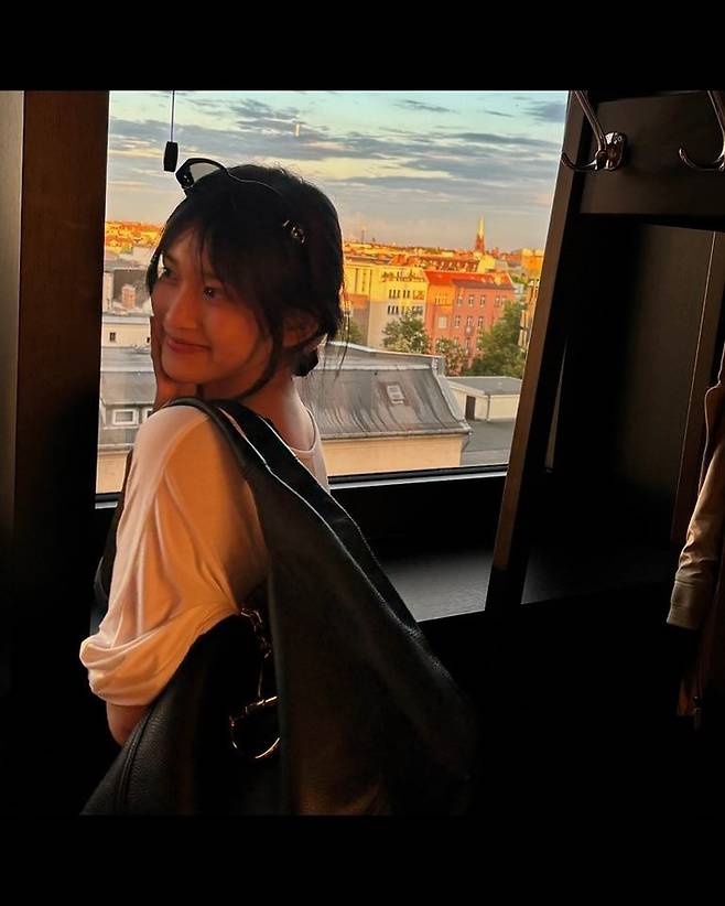 백색 티셔츠를 입고 세련된 검은색 가방을 어깨에 멘 이서와 황금빛 저녁 햇살이 어우러져 포근하고 여유로운 느낌을 더한다. 이서의 부드러운 미소와 자연스럽게 흐트러진 헤어스타일은 일상의 순간을 자연스럽게 드러냈다.