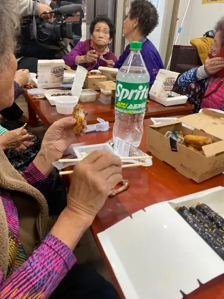 우물우물 입에 넣던 할머니, 할아버지들이 오랜만이라 맛있다고 먹었다. 가까이 붙어 앉으니 더 많은 게 보였다. 껍질을 뜯어내거나, 씹기 힘들어하는 할머니가 있었다.