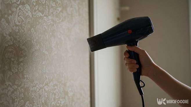 5분 정도 기다려 벽지가 수분을 충분히 머금고 부드러워졌다면 헤어드라이어로 벽지를 살짝 말려준다. 바람 온도는 미지근하게하고 5~10초 정도만 말리면 된다.