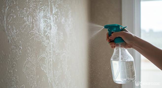 물이 벽지에 조금씩 스며들도록 분무해 벽지가 촉촉해졌다면 약 5분 정도 그대로 기다린다. 이때 축축해질 정도로 물을 많이 뿌리게 되면 물 얼룩이 남거나 벽지가 쉽게 찢어질 수 있기 때문에 주의가 필요하다.