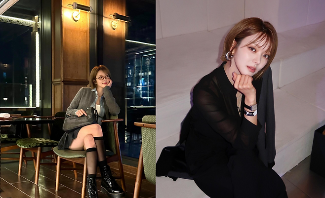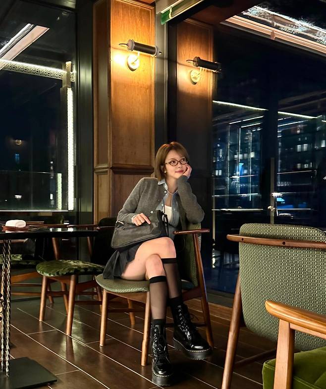 세련된 카페에서 지적이고 우아한 분위기를 자아내고 있다. 그레이 카디건과 미니스커트의 조합으로 여성스러움과 모던함을 동시에 표현했다. 특히 블랙 레이스업 부츠와 안경으로 포인트를 주어 패션 감각을 한층 업그레이드시켰다. 밤 풍경이 보이는 창가에서 연출된 이 룩은 도시적인 세련미와 지적인 분위기를 완벽하게 조화시키고 있다. 초아의 이런 스타일링은 데이트나 가벼운 모임에서 참고하기 좋은 세련된 룩을 제시한다.