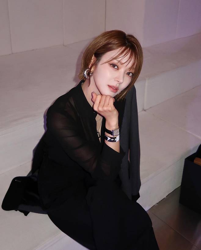 시크한 올블랙 룩으로 강렬한 존재감을 드러내고 있다. 블랙 시스루 블라우스와 팬츠의 조합은 단순하면서도 세련된 분위기를 연출하고 있다. 미니멀한 액세서리와 함께 연출된 이 스타일은 초아의 세련된 패션 감각을 엿볼 수 있는 대표적인 예다. 특히 손목에 착용한 시계와 팔찌는 심플한 올블랙 룩에 포인트를 주어 지루함을 덜어내고 있다. 어떤 자리에서도 품격 있게 소화할 수 있는 올블랙 룩은 초아의 다재다능한 스타일링 능력을 보여준다.