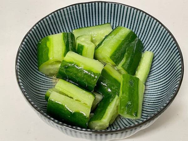 사과식초 오이무침: 오이 1개, 사과식초 1큰술, 소금 약간, 참기름 몇 방울